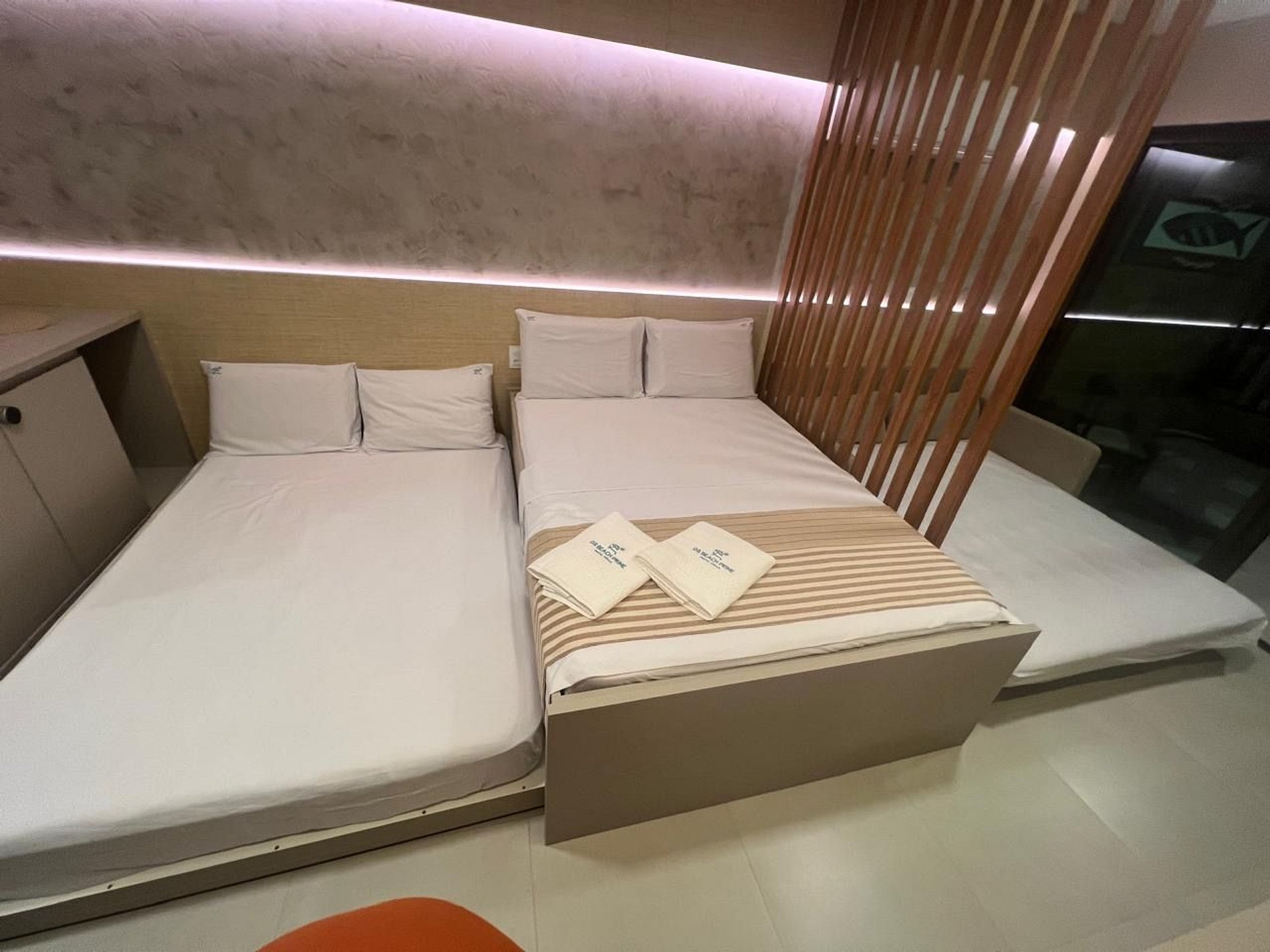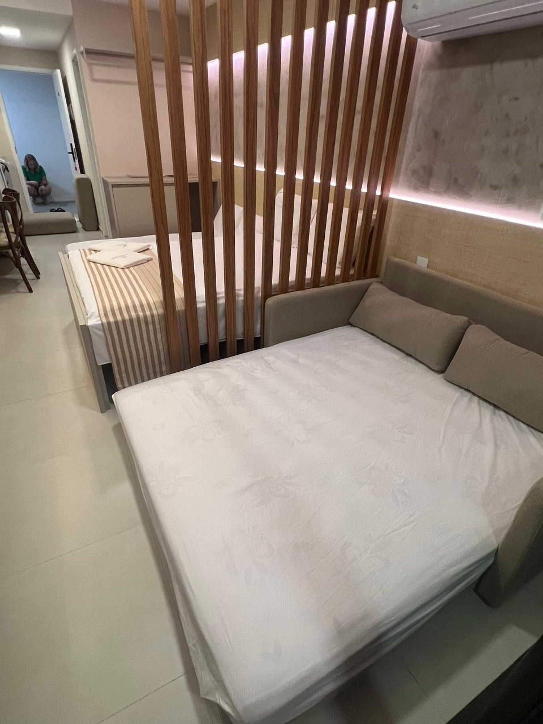 Acomodações confortáveis: Uma cama de casal, uma bicama de casal e um sofá-cama que também se transforma em cama de casal.